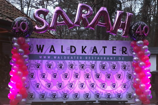Wir fangen mit dem Außenbereich bzw. Eingangsbereich für diese Feier an, denn dort haben wir 3 Meter hohe Ballonsäulen zum 40. Geburtstag aufgestellt. An diesen Luftballonsäulen haben wir fliegende Buchstaben aus Folienballons (mit Helium) befestigt - hier sehen alle Gäste sofort wo die Feier anfängt!