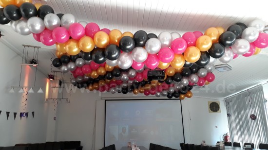 Im folgenden Bild haben wir mehrere Luftballongirlanden (in den Wunschfarben des Kunden) für eine Feier aufgehängt, dadurch wurde die nicht so festliche Decke versteckt und der gesamte Raum bekommt einen schönen festlichen Charakter - hier möchte man doch sofort feiern!