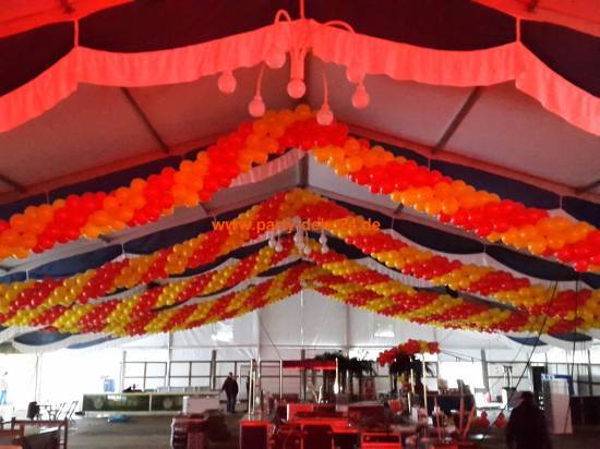 Das Ergebnis nach ein paar Stunden Arbeit waren 5 Ballongirlanden mit je 20 Meter Länge, also haben wir für diese Karneval Deko im Zelt insgesamt 100 Meter Luftballongirlanden angefertigt, dafür wurden rd. 2500 Luftballons befüllt und verknotet: