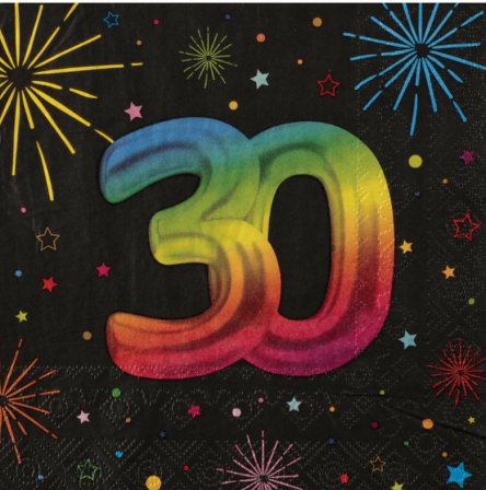 Spektakulär und auffallend, so muss er sein, der 30.Geburtstag. Da werden ihre Gäste Augen machen. Diese schwarzen Papierservietten mit neonfarbenden, bunten Sternen und Punkten und mittiger Zahl 30 ist ein Highlight für Tisch und Tafel. Lagerbestand: 2 Stück Maße: 33 x 33 cm, ausgefaltet ! Inhalt: 12 Stück Bestandteile |