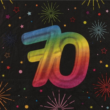 Spektakulär und auffallend, so muss er sein, der 70.Geburtstag. Da werden ihre Gäste Augen machen. Diese schwarzen Papierservietten mit neonfarbenden, bunten Sternen und Punkten und mittiger Zahl 70 ist ein Highlight für Tisch und Tafel. Maße: 33 x 33 cm, ausgefaltet ! Inhalt: 12 Stück Bestandteile |
