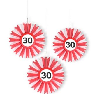 Eine Dekoration aus Party-Deko-Fächer zum 30. Geburtstag in Verkehrsschilddesign zum Aufhängen in der Wohnung, Partyraum, Partykeller, Restaurant,.. 3-tlg. aus Kunststoff/Pappe. Maße je 30,5 cm Ø Lagerbestand: 1 Stück |
