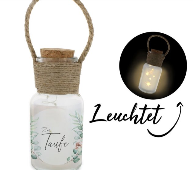 Wunderschöner Deko-,und Geschenkartikel für Tisch und Tafel in Form von dieser Glasflasche mit Naturhenkel und Batterie für zauberhaftes Sternenlicht. Maße: 15 x 6 cm (ohne Henkel gemessen) |