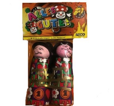 Silvester Spass im 2er Set zum Jahreswechsel für die ganze Familie in Form von diesen anzündbaren Tischfeuerwerk. Maße je: 8,5 cm. Einfach anzünden und Peng kommen kleine Glücksbringer herausgeschossen. Ab 12 Jahren ! |